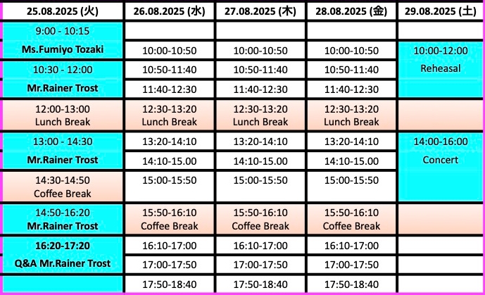- 8月29日 – 午前中・ミニレクチャー&リハーサル/午後・修了コンサート(トロースト先生の指導の元、ステージトレーニングの一環として行われます)ステージトレーニングについてはこちらから